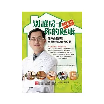 本書作者江守山醫師,從多不勝數的醫學研究及臨床經驗中發現,房屋做為人的第三層皮膚,對人體健康有著非常大且超乎想像的影響力。絕對不能輕忽住宅環境的健康品質,因為,不健康的房屋將造成居住者:精神不濟、鼻塞、眼睛癢、喉嚨乾、頭痛等症狀不斷,也會變得容易過敏、氣喘,而且致癌機率大增!更何況,人一生中有90%的時間都在屋內,而許多人存的畢生積蓄只為了買一間房子,怎麼能輕率、大意!全書澄清許多似是而非的住宅環境安全迷思,提供正確且實用的裝潢翻修守則、自我評鑑健康房屋的資訊與新知,教你房子健康檢測不求人,輕鬆趕走家中污染源,築一個安全、健康又樂活的居家環境!!